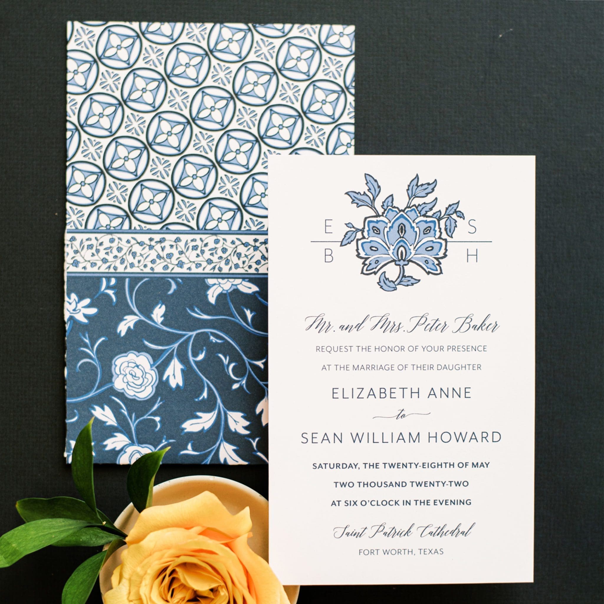 We love this wedding suite inspired by the beautiful and intricate patterns of chinoiserie. Each element in the suite is hand-drawn, featuring delicate vines, flowers and other classic motifs from this timeless style. The wedding monogram also features a modernized chinoiserie flower, set against a soft white background. The invitation was designed to fit into its own custom pocket decorated with a mix of Chinoiserie-inspired patterns. Our custom envelope liners add an extra special touch to make the suite truly unique. This wedding suite was featured in the Spring-Summer issue of Brides of North Texas.